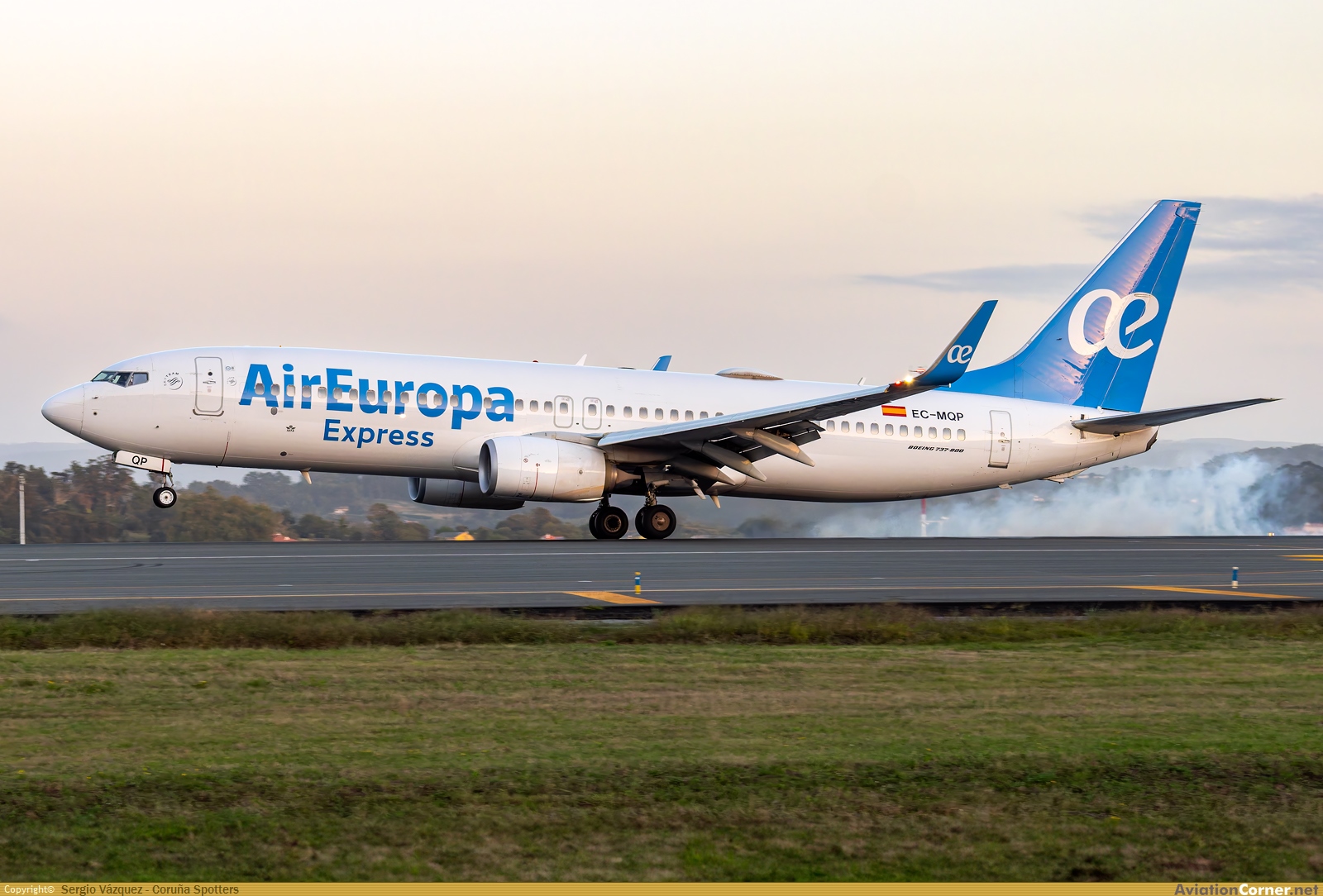 Boeing 737-85P de Air Europa Express (EC-MQP, MSN 60585) tomando tierra por la pista 03 del aeropuerto de A Coruña. El avión, entregado nuevo a la aerolínea en 2017, está propulsado por dos motores CFM56-7B26 y luce los colores actuales de Air Europa Express.