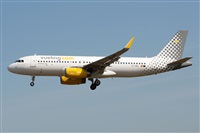 Vueling 37XG (VY1221) procedente de Lyon, en corta final de la pista 24R. Número de serie 6450, bautizado como "You're the Vueling that I want" hasta su repintado, y entregado nuevo en febrero de 2015.