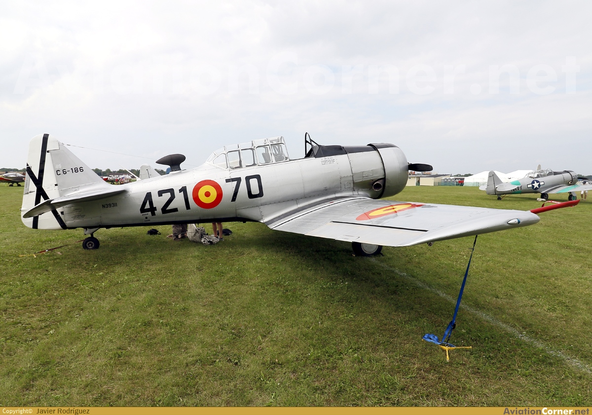 "Presencia" española en el EAA 2025. Este Texan fabricado en 1942 llegó a españa a mediados de los años 50 y fue matriculado C.6-186 y lleva las marcas 421-70, cn 168-107