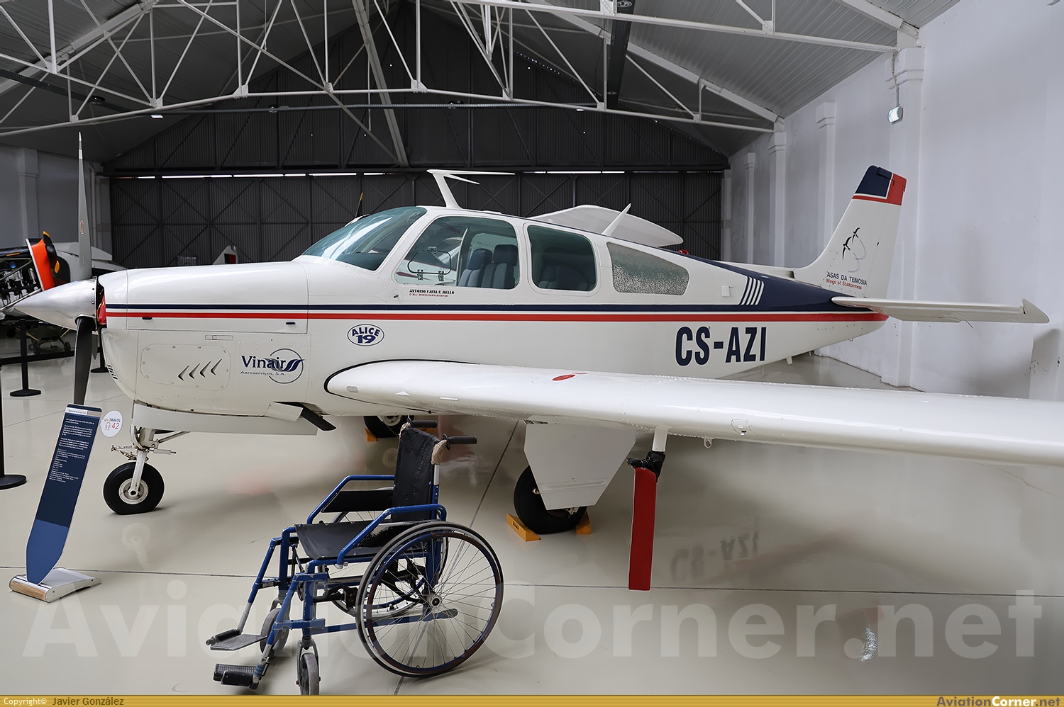 El aviador en silla de ruedas Antonio Faria e Mello voló en esta Bonanza hasta su muerte en 2006, por eso la silla acompaña a la avioneta en el Museu do Ar.