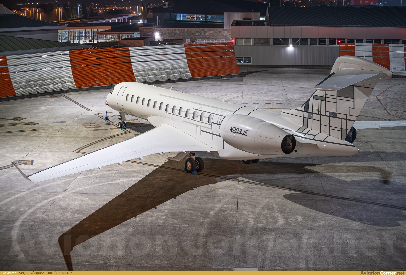 El impresionante Bombardier Global 7500 (N203JE) descansando en el stand 13 del aeropuerto de A Coruña, posición habitual para este jet ejecutivo durante sus estancias en Alvedro.