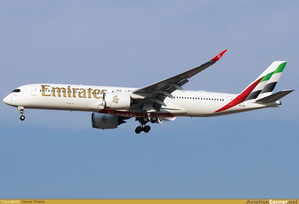 Tras unos ejercicios de vuelos en formación. El 13º A350 de Emirates y el último en ser recibido.