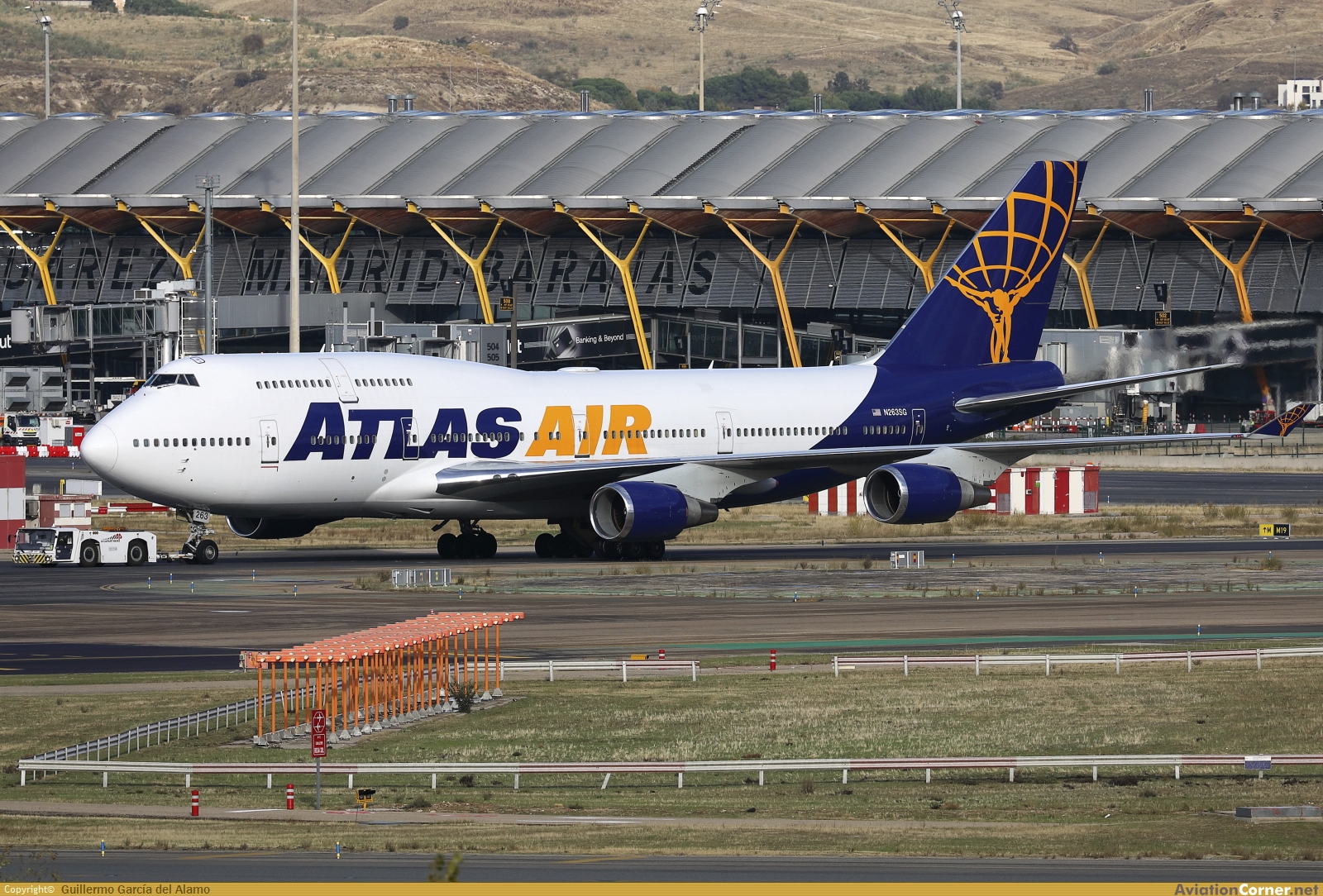 Aquí vemos al avión del equipo de los Dolphins rodando hacia su parking remoto, uno de los pocos 747 de Atlas configurado para pasaje.