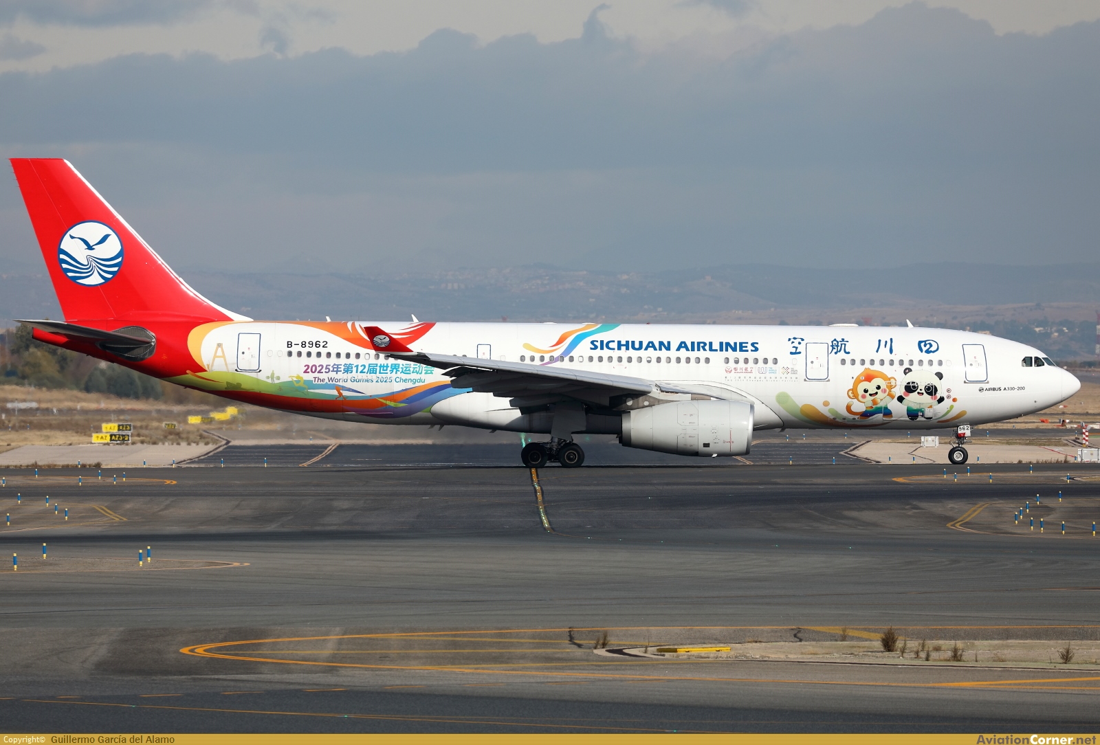 En la temporada de invierno Sichuan Airlines está empleando sus A330 en la ruta a Madrid (tanto la versión -200 como -300) que igualmente incorporan curiosos colores como este "The World Games 2025 Chengdu"