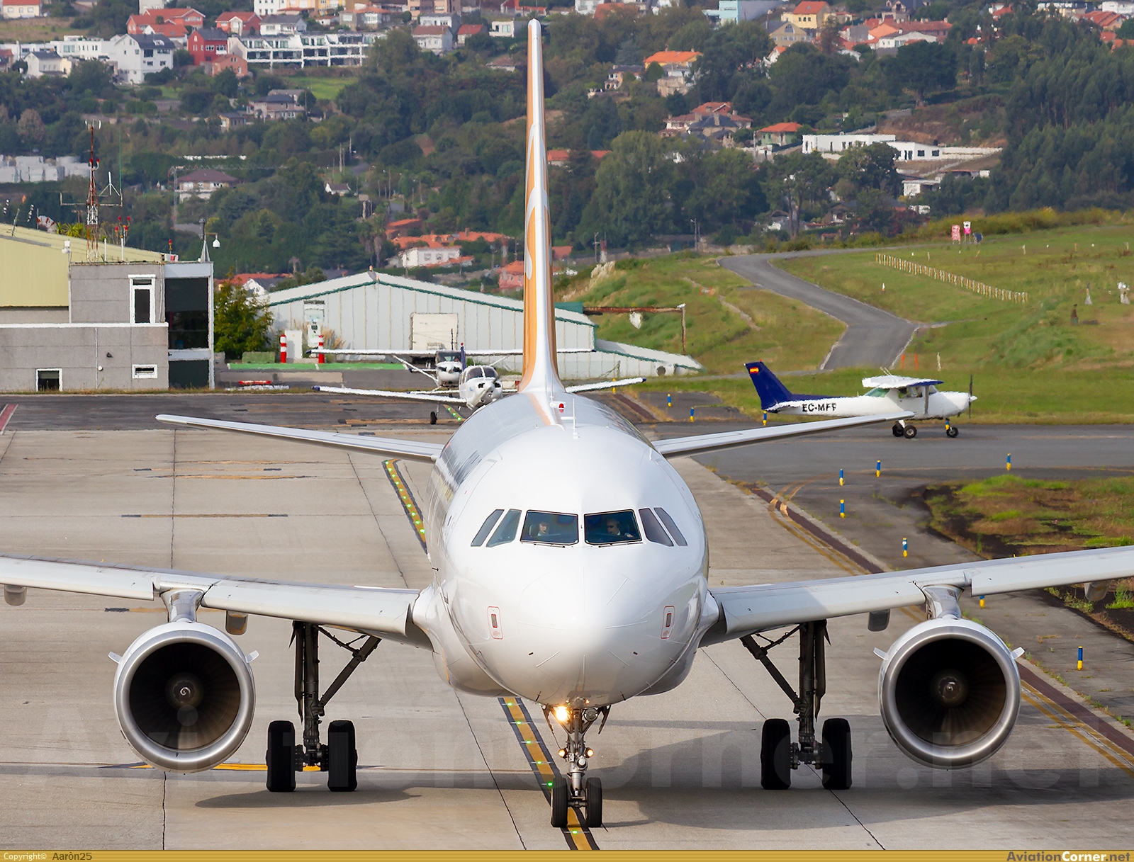 Iniciando el rodaje a la 03 via Sierra. Mientras tanto, al fondo, las avionetas de la escuela saliendo como si de un "scramble" se tratase, y es que en esa tarde salieron a volar prácticamente todas las aeronaves que Atlantic Air Academy (antes AFN) tiene en el aeropuerto coruñés.