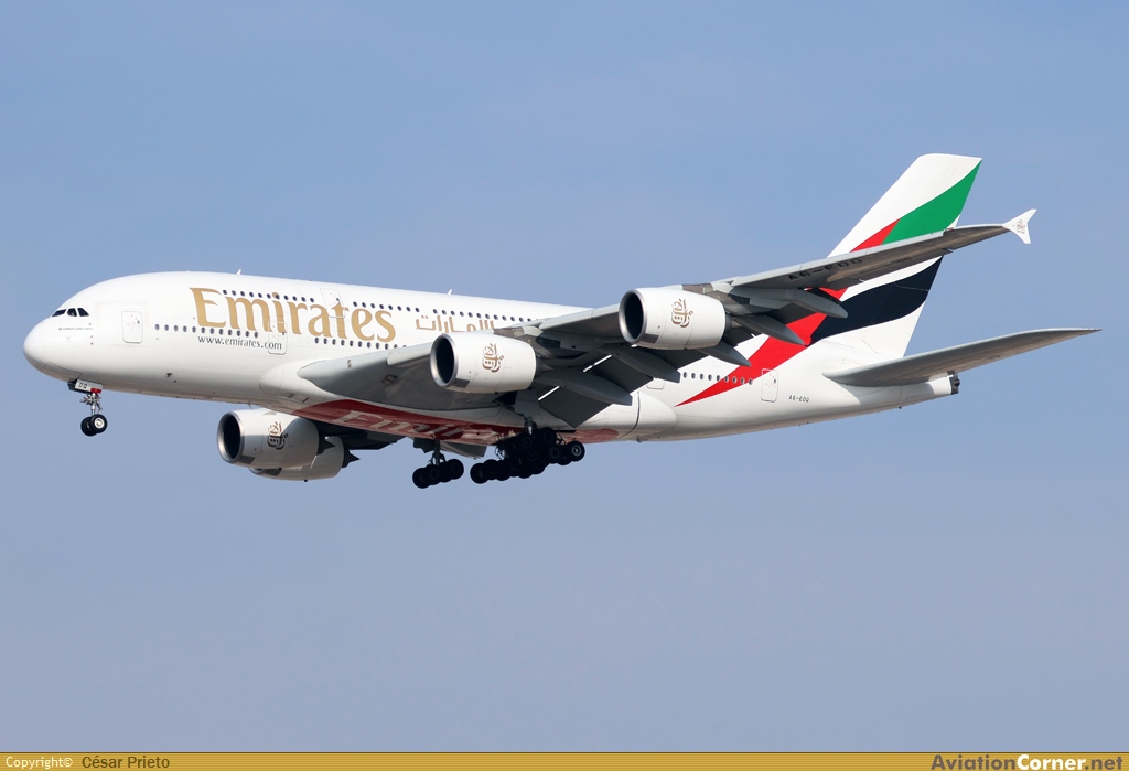 La mayoría de los A380 de Emirates llegan y salen en horario nocturno, pero alguno cae en horas diurnas.
