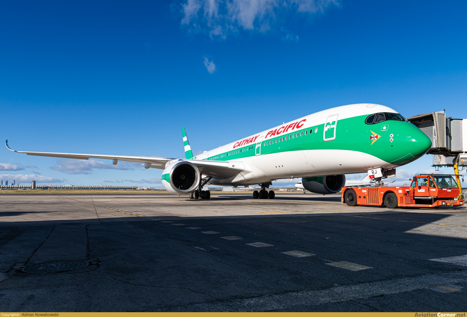 Primera visita a Madrid en su quinto servicio comercial tras ser decorado con la librea retro que conmemora el 80 aniversario de la fundación de Cathay Pacific.