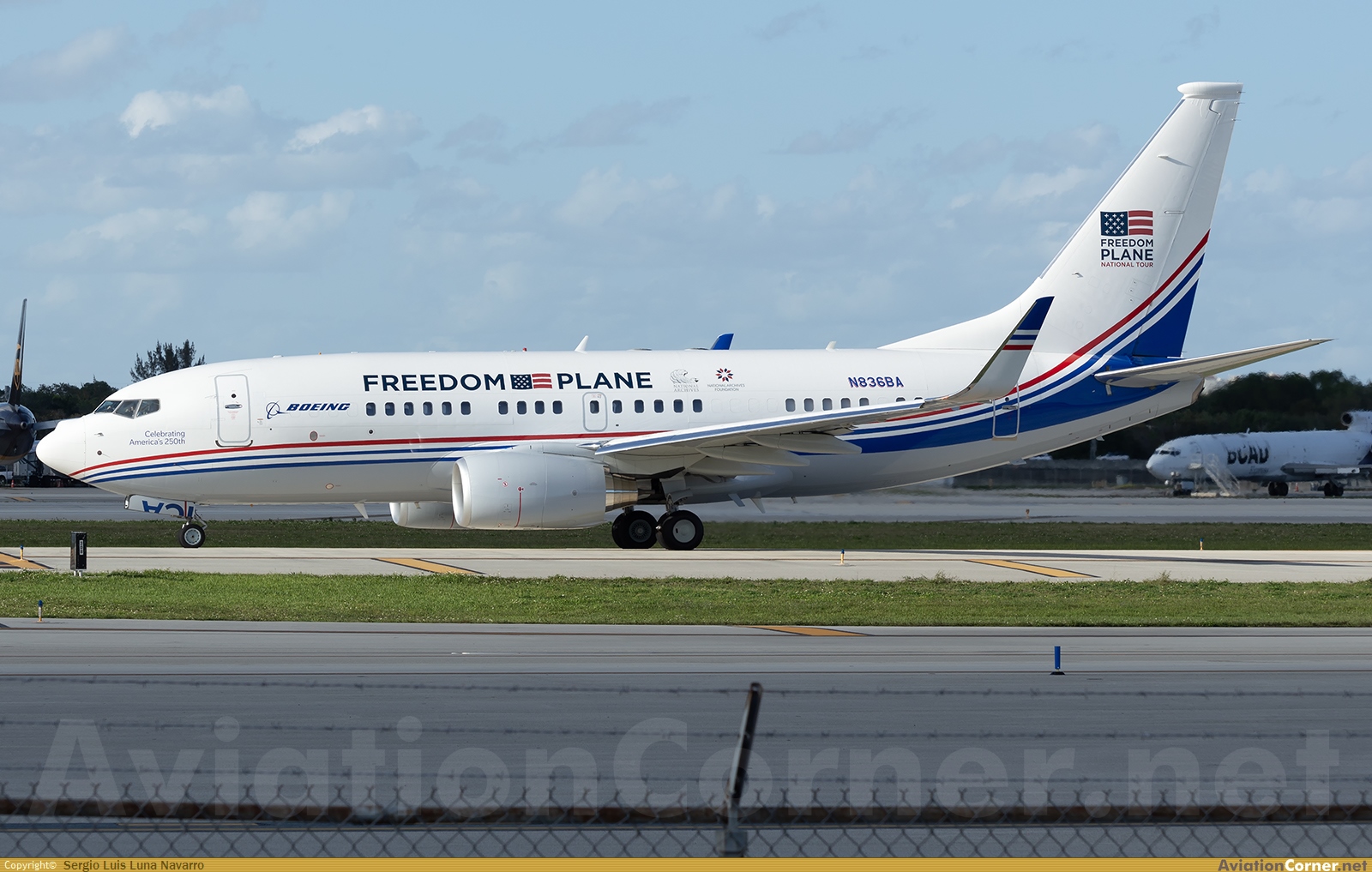 A Boeing BBJ painted in patriotic “Freedom Plane” livery.