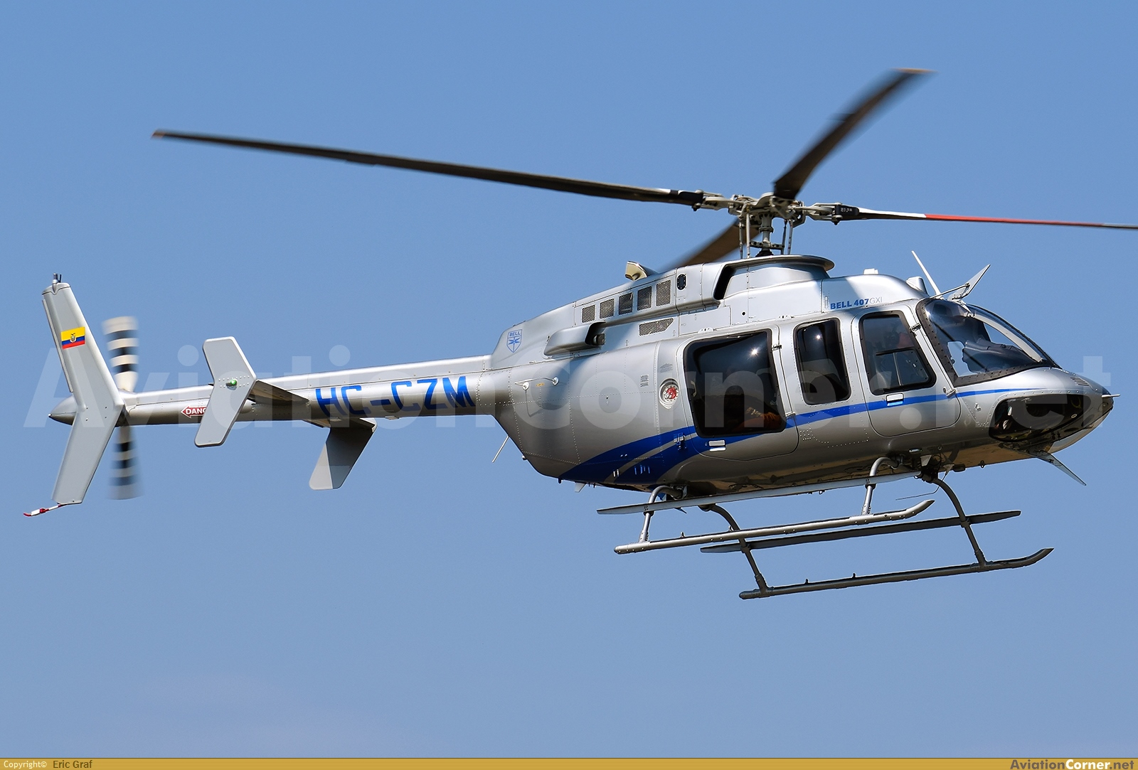 Impresionante B407 en pleno aterrizaje. El "CZM" llegando desde Cuenca (SECU) en una tarde calurosa. Me gusta mucho cómo luce su livery, casi idéntico al del HC-CTD, del mismo propietario que este helicóptero.