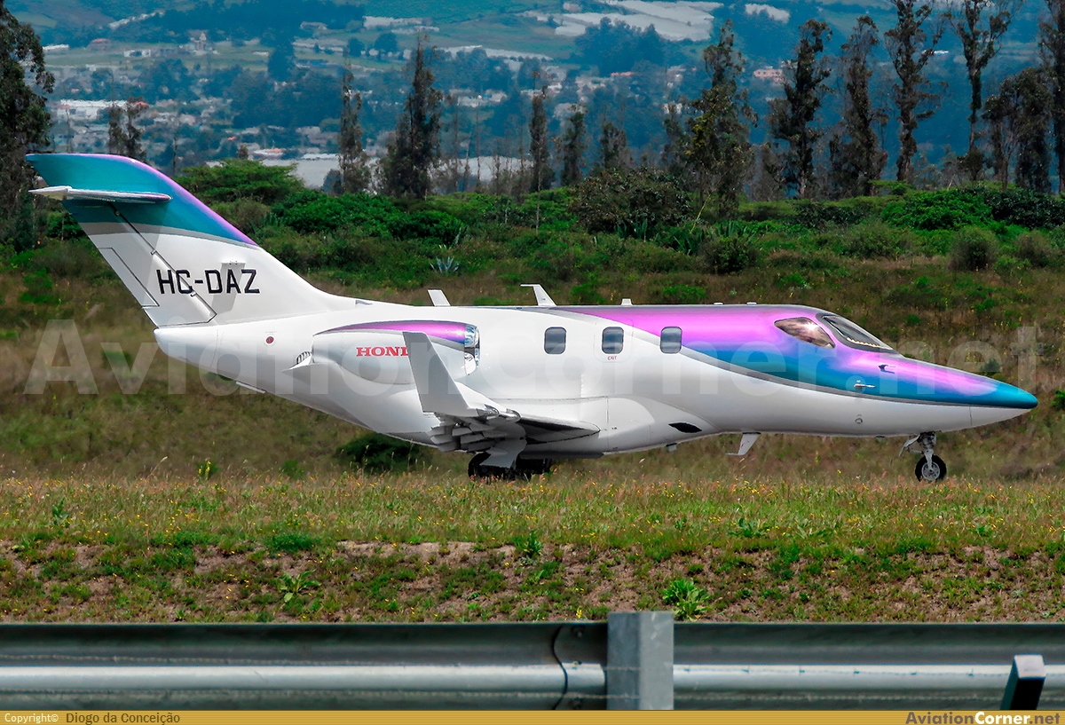 El último ejemplar de la serie de matrículas HC-DA? un hermoso Hondajet con colores tornasol que cambian con la posición. El primer Hondajet matriculado en Ecuador y el segundo que ha sido basado aquí. Generalmente este privado realiza vuelos Guayaquil - Quito y viceversa aunque ya ha visitado a la fecha Santa Rosa y Salinas también. Por ende, rodando para su despegue por la pista 36 rumbo a Guayaquil.