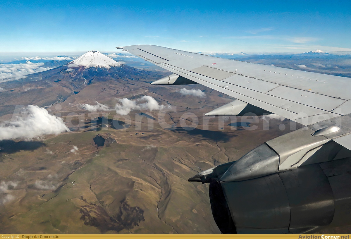 Durante nuestro vuelo el Volcán Cotopaxi se hizo presente desde mi ventanilla en primer plano. Se pueden ver los "buckets" de las reversas clásicas del B737-200. A la derecha a lo lejos se ve el Volcán Cayambe.