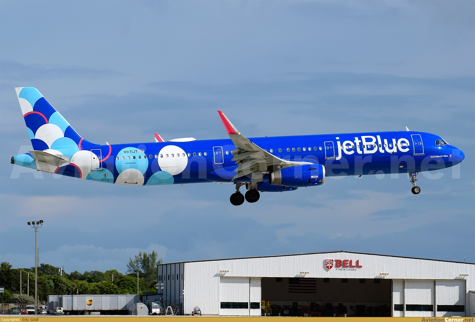 Una curiosidad sobre este A321 "Don't Mind If I Blue" es que lo he visto dos veces en FLL, tanto con el livery antiguo como con el nuevo. Me di cuenta al revisar fotos antiguas de 2020-2021. Aquí podemos ver el "B61601" aterrizando por la pista 10L procedente de Nueva York (JFK) en una mañana soleada. Me gusta mucho el hangar de Bell que se ve al fondo de las fotos.
