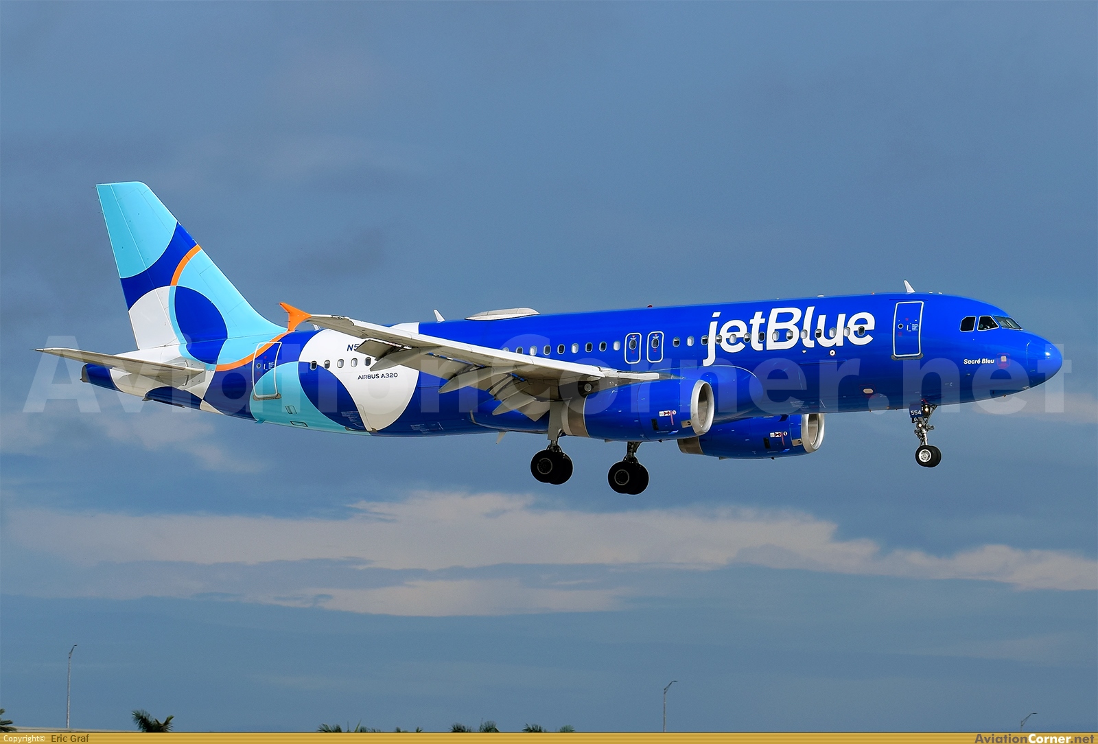El vuelo "B6959" arrivando por la pista 10L procedente de Windsor Locks (BDL) en una mañana soleada. Este A320 se llama Sacré Bleu. Me estoy dando cuenta de que me está gustando mucho el nuevo livery de JB.
