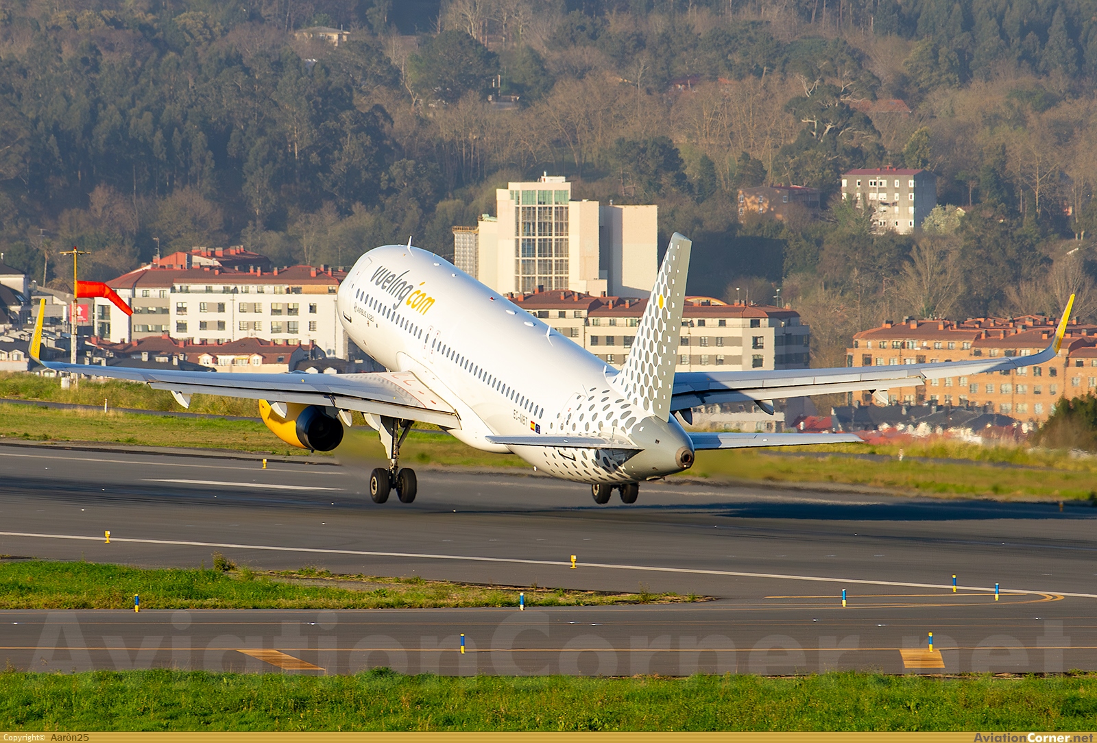 El Vueling 1295, operado por el Mike Bravo Tango, levanta finalmente el vuelo tras una larga y pesada carrera de despegue por la 03 con destino Barcelona.