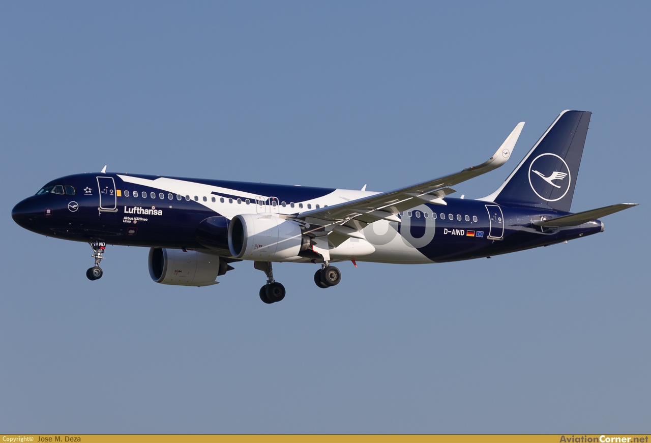 Librea conmemorativa de los 100 años de Lufthansa es el segundo A320neo al que se le aplica ésta librea, en su primera visita a Barcelona