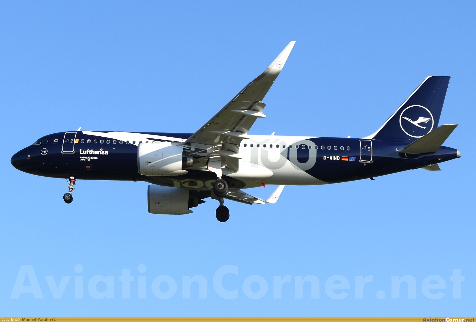 Librea especial con que Lufthansa ha cubierto el fuselaje de algunos de sus aviones con motivo de la conmemoración de los 100 años de la creación de esa compañía aérea alemana.