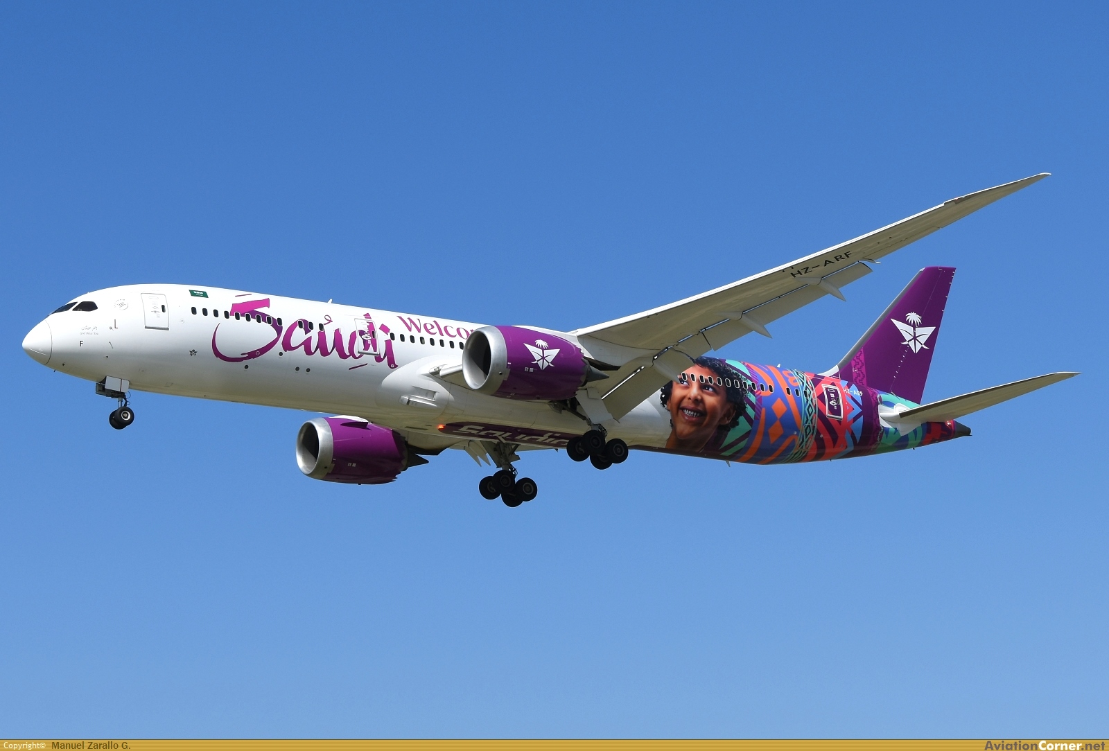 B789 de Saudia aterrizando en el Josep Tarradellas-Barcelona-El Prat con esta bonita librea especial "Welcome to Arabia"