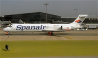 "Romeo-oscar", un bonito y nuevo (mayo-2008, cn.55067) B-717 de Spanair, soltando calzos.